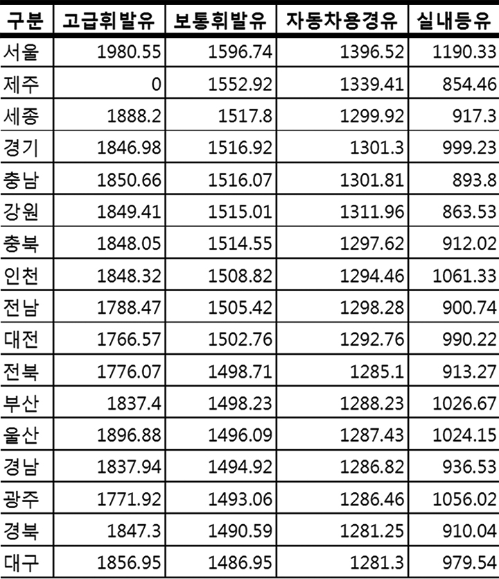 오피넷 수치상 부산 1984.89원, 대구 1983.23원, 광주 1982.81원으로 서울과는 40원 안팎 차이가 납니다.