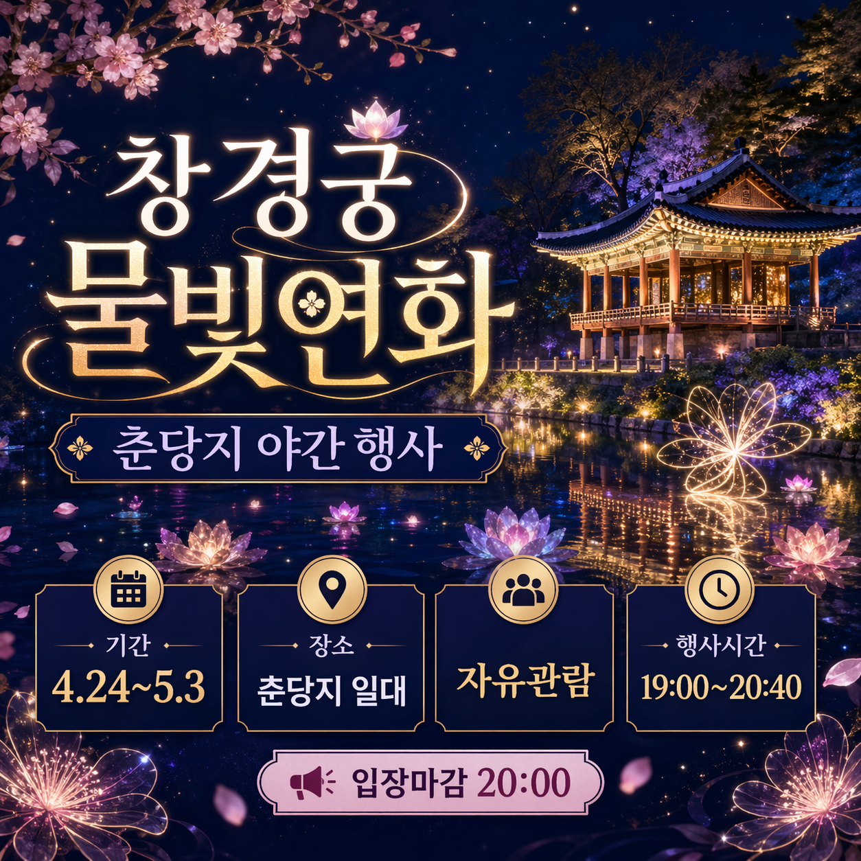 놓치기 쉬운 포인트는 관람은 21시까지지만 입장은 20시 전에 해야 한다는 점입니다. 물빛연화를 보려면 19시 전후로 입장해 춘당지 방향으로 이동하는 동선이 가장 무난합니다.