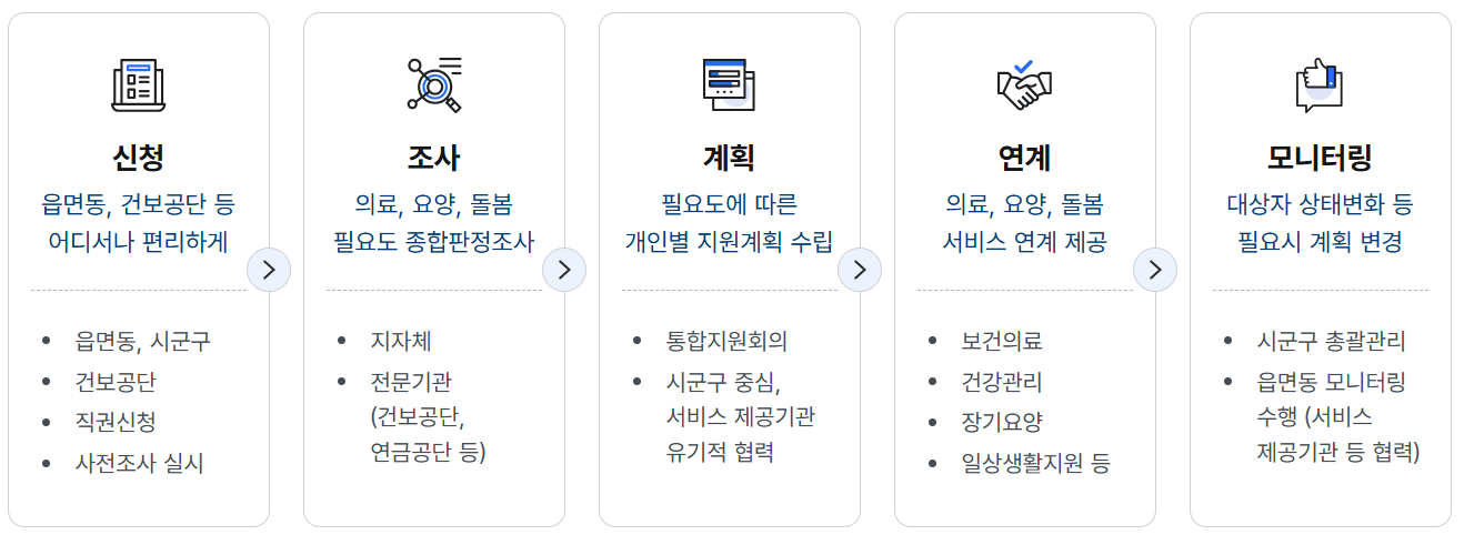 | 기본 절차 | 신청 → 사전조사 → 종합판정/자체조사 → 개인별 지원계획 → 서비스 연계 → 모니터링 |